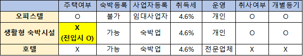 흔히들 오피스텔, 생활형숙박시설, 호텔 등의 비슷한 특성 때문에 헷갈려 하시는데, 비교하는 표를 보도록 하겠습니다.