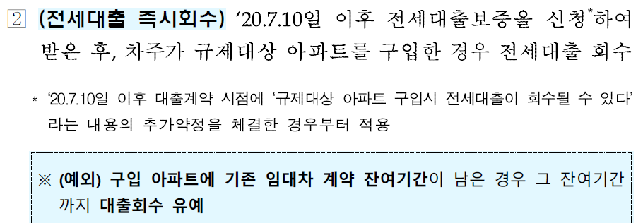 : 2020년 7월 10일 이후 전세자금대출을 받은 후 규제대상 아파트를 구입한 경우에는 전세대출을 회수함