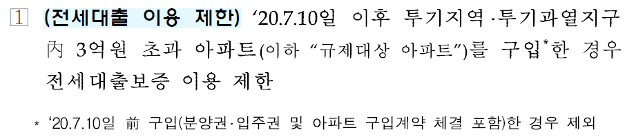 : 2020년 7월 10일 이후 투기지역/투기과열지구 내 3억원을 초과하는 아파트를 구입 한 경우 전세자금 대출 불가
