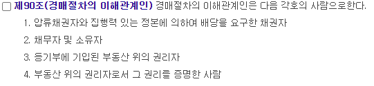 여기서 알수있는 점 하나는 바로 이해관계인으로 '법에 규정한 자' 라는 점입니다. 그냥 연관있다고 다 이해관계인이 되는것이 아니라는 말입니다. 민사집행법에서는 부동산의 경매절차에서 당해 부동산에 대한 이해관계인을 명확하게 규정하고 있는데요. 민사집행법 제90조에서는 다음의 사람들을 경매절차의 이해관계인으로 규정하고 있습니다.