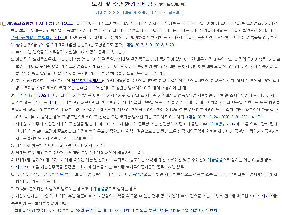 도시 및 주거환경 정비법(이하 도정법)에 따르면 제39조(조합원의 자격 등) ①항에 이렇게 나와 있습니다.