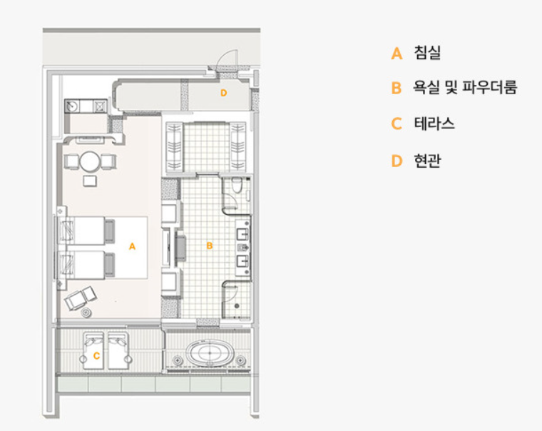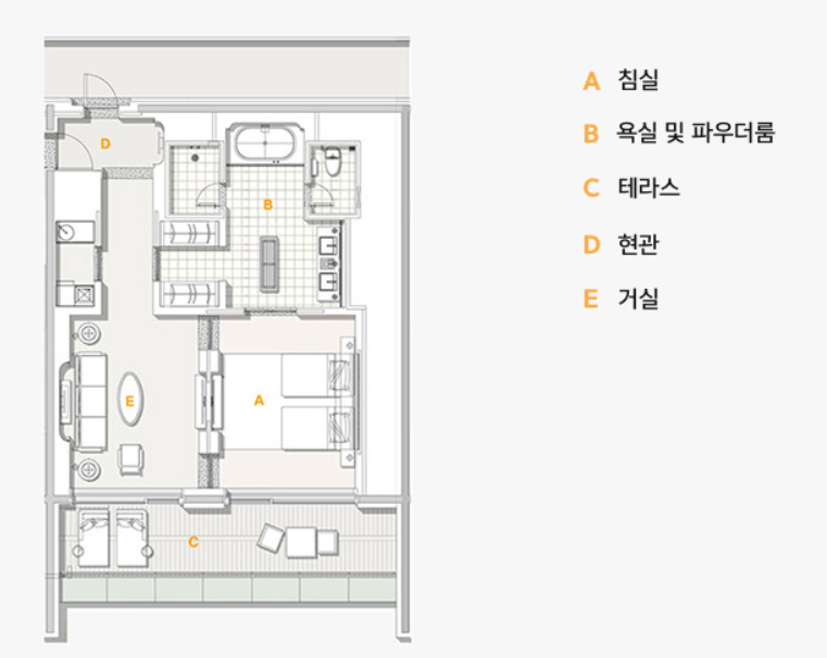 침실이랑 욕실이 좀 작아진 대신, 거실을 따로 구분해 둔 타입으로 욕조에서 바다는 보이지 않지만 분리된 느낌으로 더 큰 객실의 느낌을 줍니다. 단, 테라스 의자에서의 바다 조망은 가능합니다.