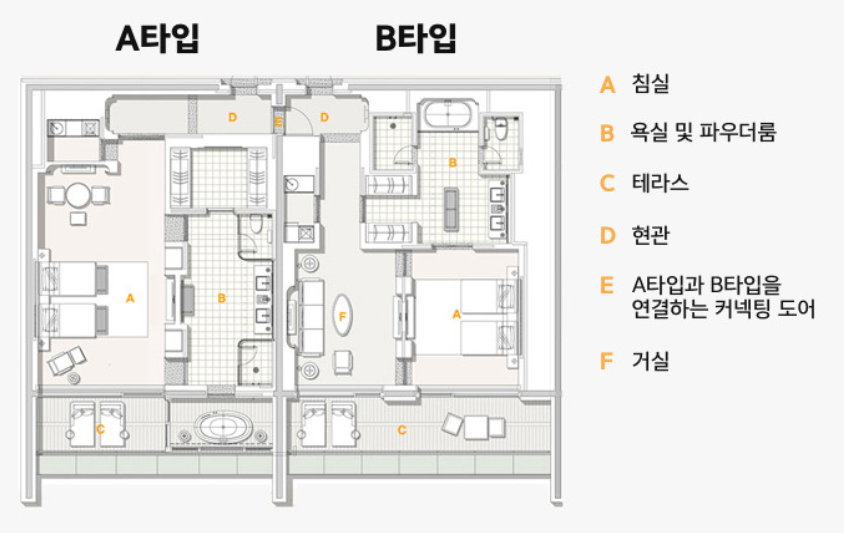 단순하게 A타입과, B타입을 연결해서 사용할 수 있게 해주는 거구요. 두 가구가 같이 여행을 갈때 같이 놀면서도 프라이버시를 지키고 싶을 때 예약하면 좋을 것 같은 타입입니다.