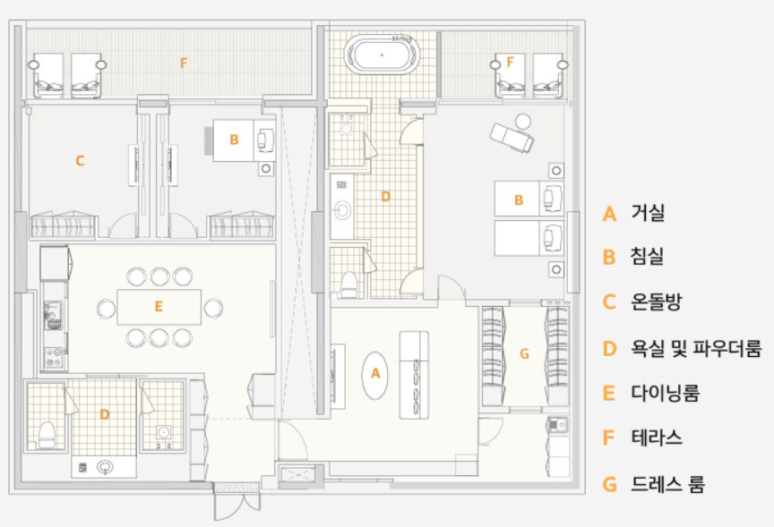 각 룸별 특징을 알아보도록 하겠습니다. 여기 나오는 자료는 아난티 공식 홈페이지(https://ananti.kr/ko/cove/)에서 확인하였으며 자세한 자료는 해당 사이트에서 확인 가능하지만 한눈에 요약하여 보기 좋게 정리 해 보았습니다.