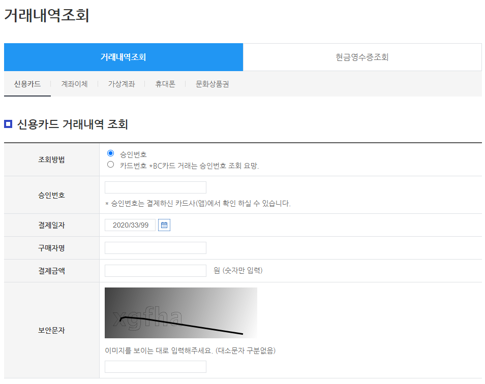 2. 필요한 정보를 입력해 줍니다. 카드번호로 하셔도 되고 승인번호로 검색하셔도 되지만 승인번호로 하시는 것을 추천드립니다. 카드사 홈페이지에 들어가면 거래내역에서 승인번호를 찾을수 있는데요 그 번호를 입력해주시면 됩니다. 카드 번호로 하셔도 되지만 이메일을 입력하셔야 하기 때문에 어느 이메일을 이용하셨는지 기억이 나지않는다면 조금 난감할 수 있습니다.
