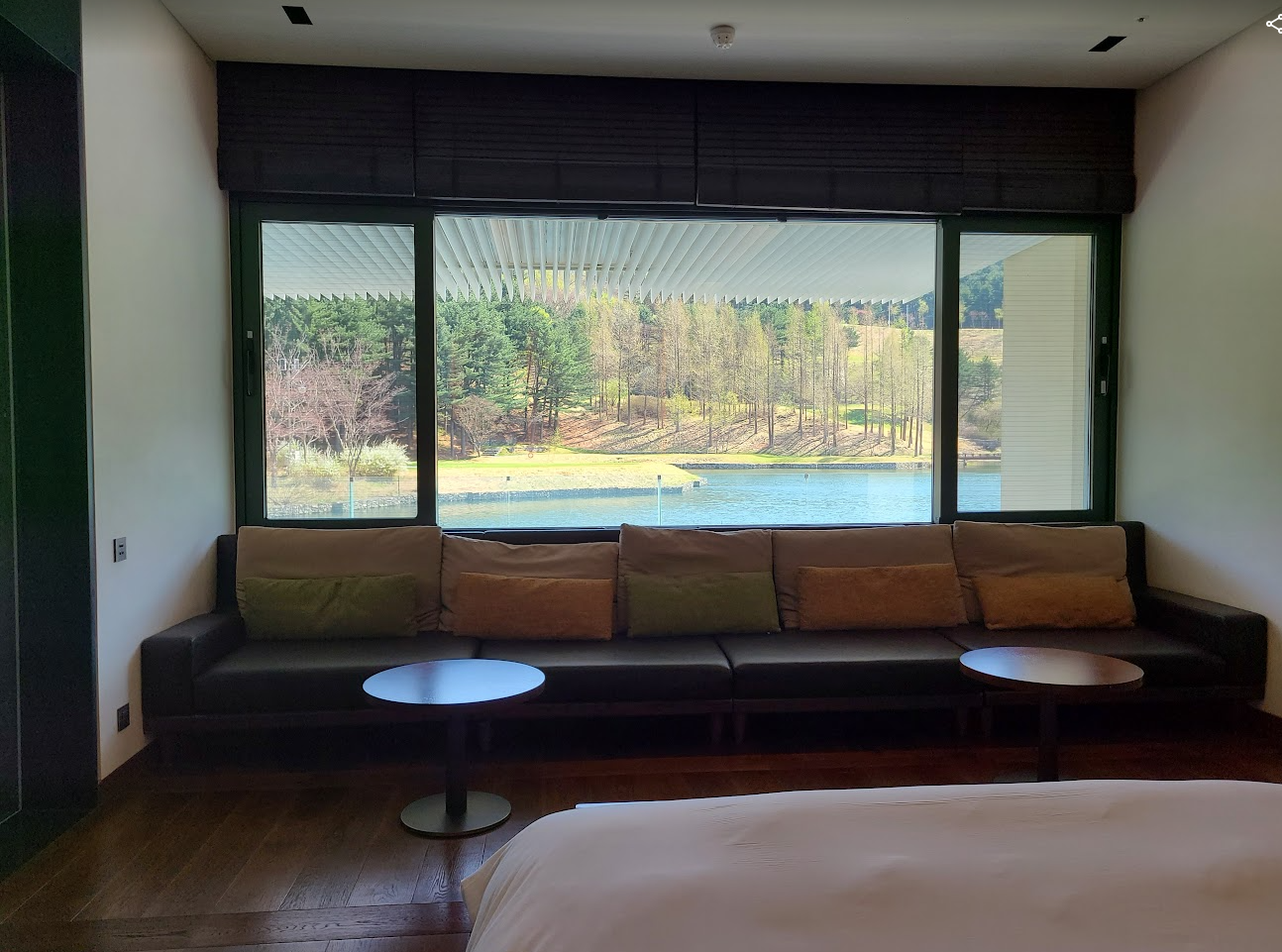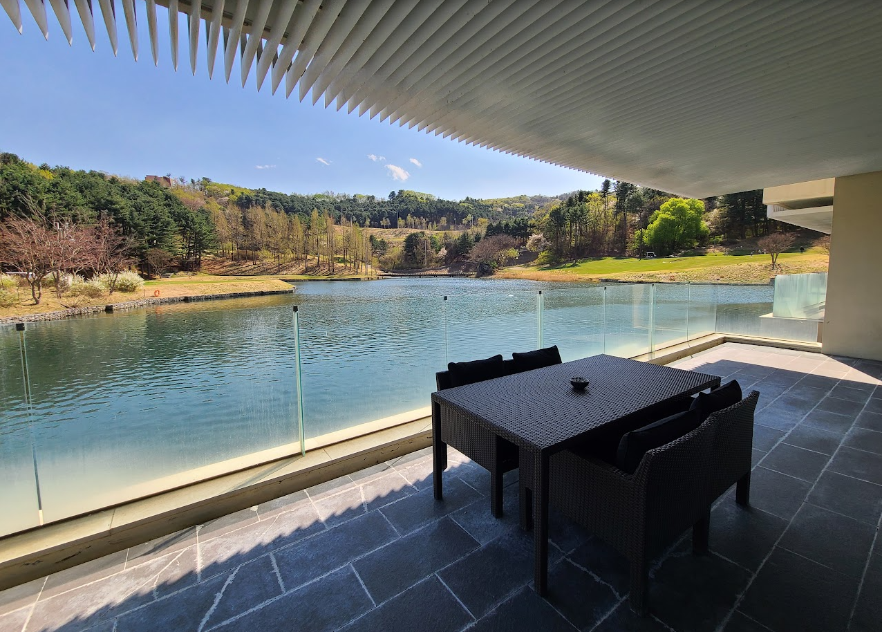 참고로, 저는 호수 가까이 있는 방이 좋아서 1층으로 골랐는데 2~4층은 좀더 Private 한 대신에 호수가 잘 보이지는 않습니다. 다만 1층은 골프장에서 안이 보일 수 있지만 그래도 호수 옆 별장같은 느낌이 조금 더 듭니다. 이건 개인의 취향이라 뭐라고 추천은 못드리겠으나 1층의 느낌은 이렇게 호수 위에 테라스가 떠있는 느낌입니다.