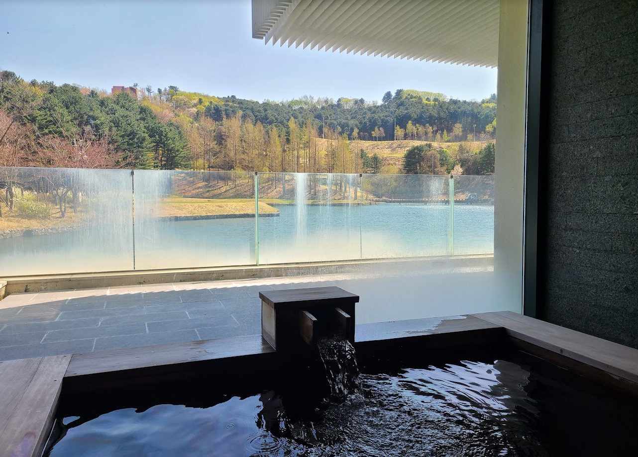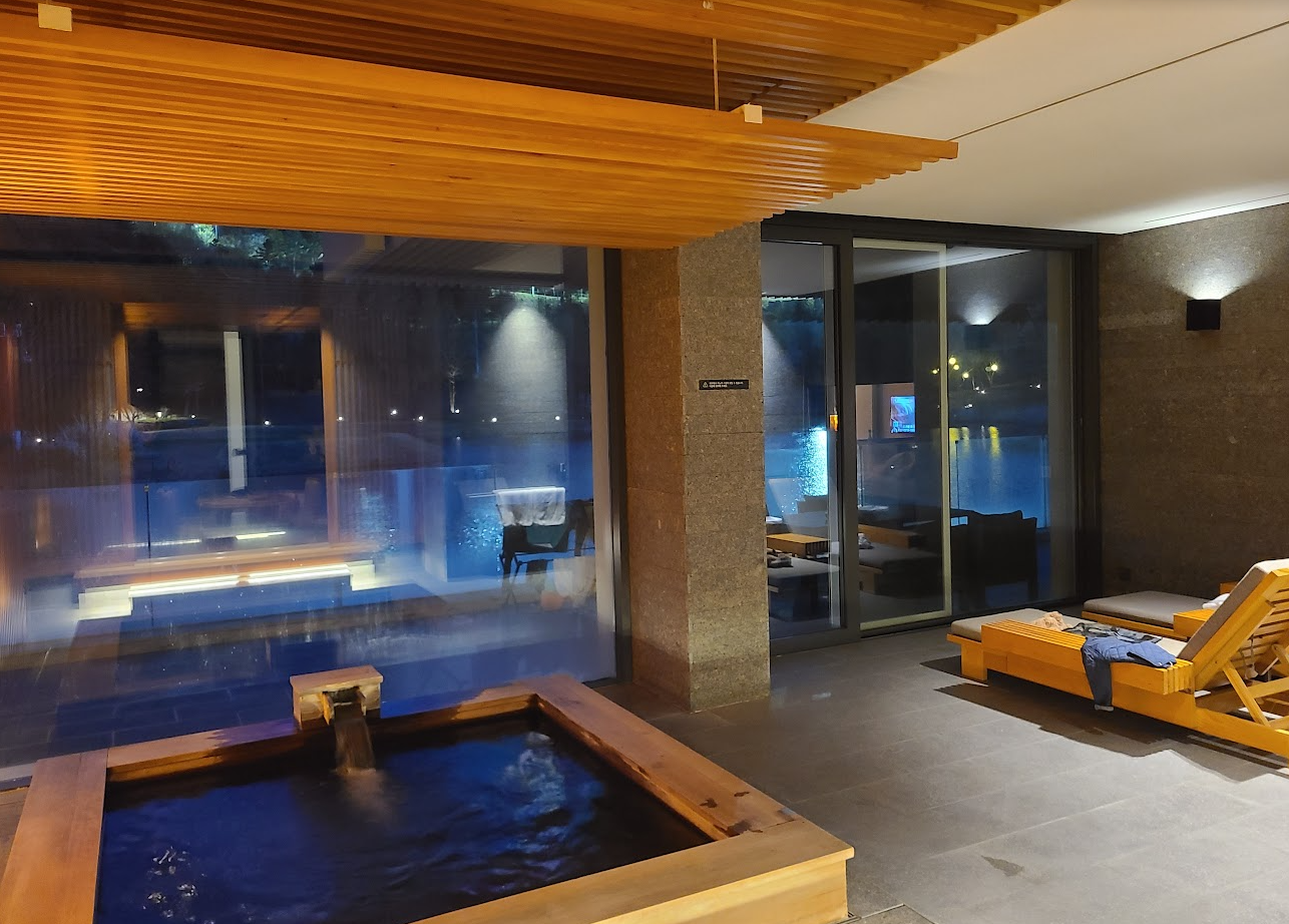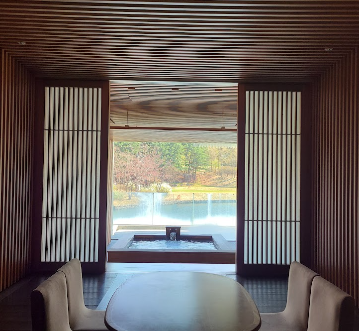 히노끼 탕에 앉으면 이런 느낌인데 호수와 맑은 하늘을 보며 반신욕을 즐기다가 옆에 준비된 데이베드에서 휴식을 취하는게, 이게 진짜 휴식이구나 느낄 수 있었습니다.