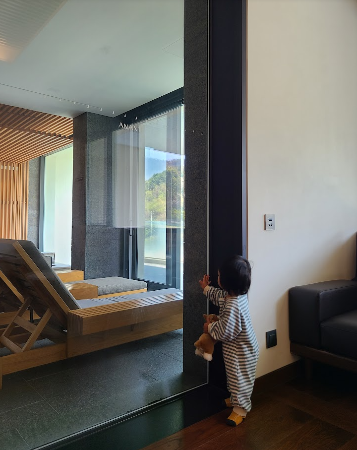 물을 보고 신나버린 제 어린 아들도 출현했지만, 위 사진을 보시면 꽤나 넓은 휴식 공간이 있어서 복잡한 느낌은 없었습니다. 반신욕 + 데이베드 + 좋은 풍경 조합은 진짜 만족도 최고였네요.