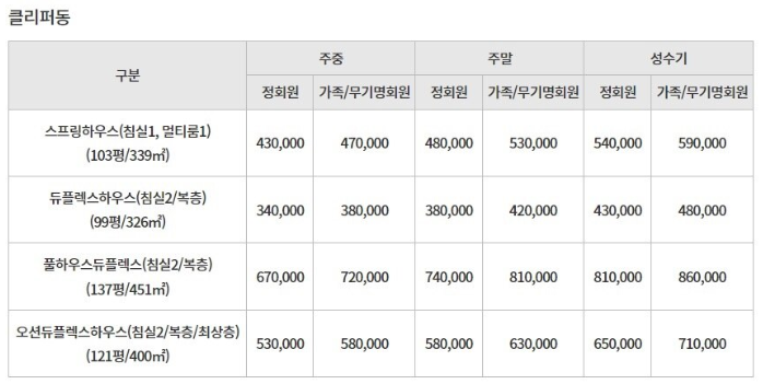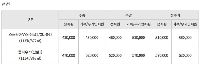 가격은 이렇습니다. 스프링하우스는 말그대로 방 안에 온천이 있는 방인데요. 43만원이면 그래도 준수한 가격을 보이는 것 같습니다. 다만 침실이 1개라 1가족밖에 갈 수 없다는점 기억하셔야겠습니다. 그리고 듀플렉스 하우스는 바다 전망이 가능한 복층호텔 정도로 생각하시면 되는데, 여기서 특이한점은 풀하우스 듀플렉스에는 침실2개 + 개인풀이 방안에 위치하고 있다는 점입니다. 가격도 그만큼 비싸지네요. 그래도 두 가족이 머물수 있기에 부담되는 가격은 아닙니다.