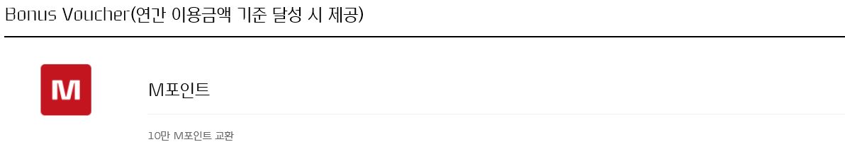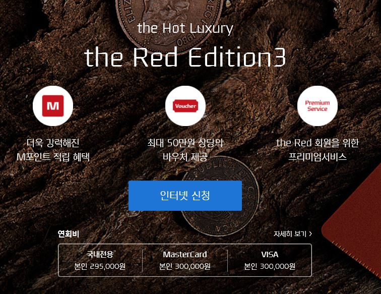 레드카드의 주요 혜택으로는 M포인트 적립과 50만원 상당의 바우처 제공, 프리미엄 서비스라고 되어있습니다.