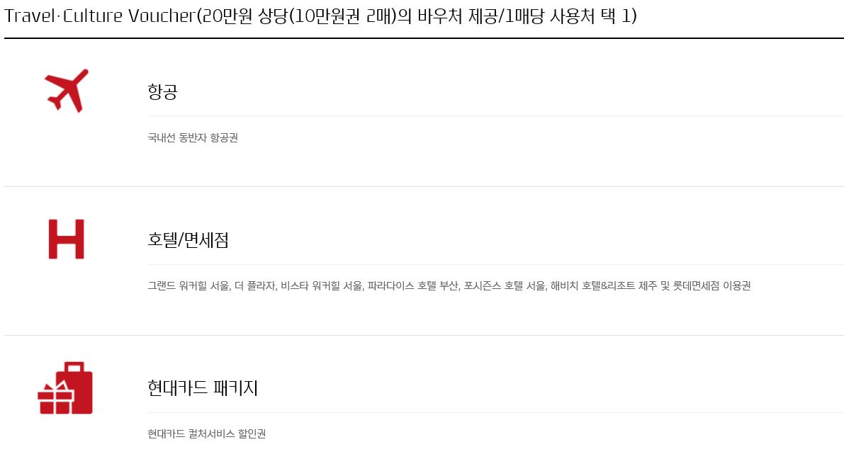 Travel Culture Voucher (트래블, 컬쳐 바우처) 인데, 각종 호텔 숙박비, 식당, 컬쳐서비스, 국내선 동반자 항공권 결재시 사용 가능합니다. 10만원 권 두장이 제공되므로 총 20만원의 혜택이 제공됩니다.