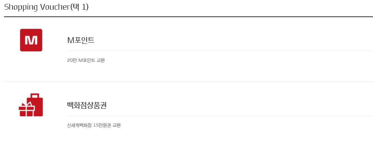 M포인트 20만 포인트나 신세계 상품권 15만원권 교환이 가능한데, 활용성이 그다지 높지않은 M포인트보다는 신세계 상품권 15만원권 교환을 추천드립니다. 이마트 등 신세계 계열사에서도 사용 가능합니다.