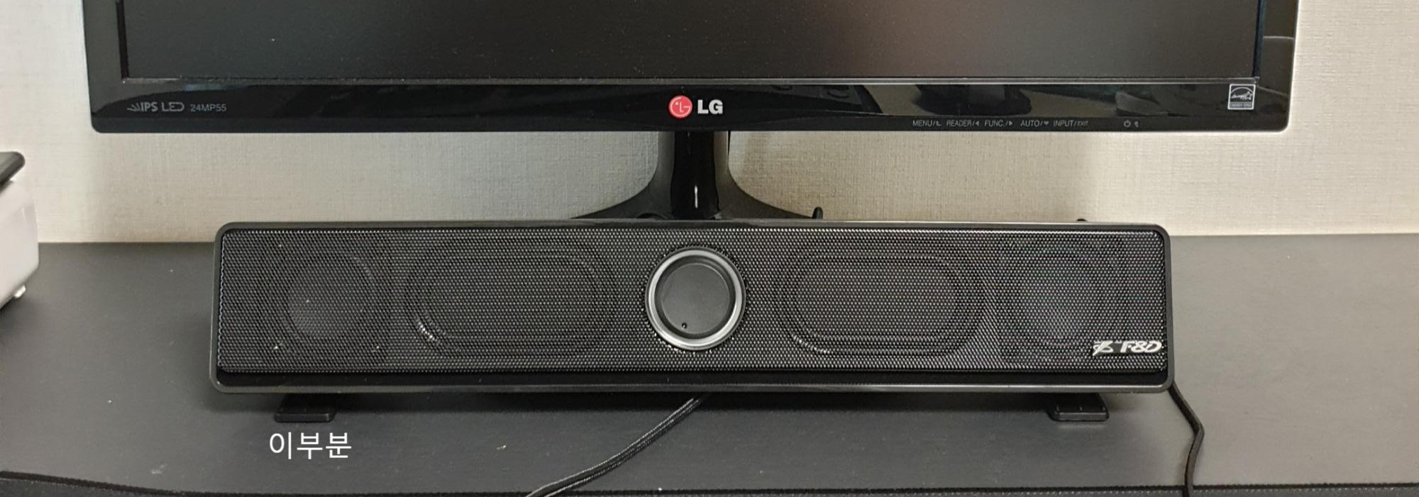 그리고 스탠드 부분이 특이한데 나사를 돌리면 높낮이 조절이 가능합니다. 보통 저렴한 사운드바는 높낮이 조절이 안되는 경우가 많아서 지금 보이는 모니터처럼 볼록한 모니터는 붕 떠서 설치해놓기도 하고 모니터 앞쪽에 설치해서 공간 효율성이 많이 떨어집니다. 하지만 이 모델은 높낮이 조절이 가능해서 어느 모니터에나 설치 가능하다는 것이 장점입니다.