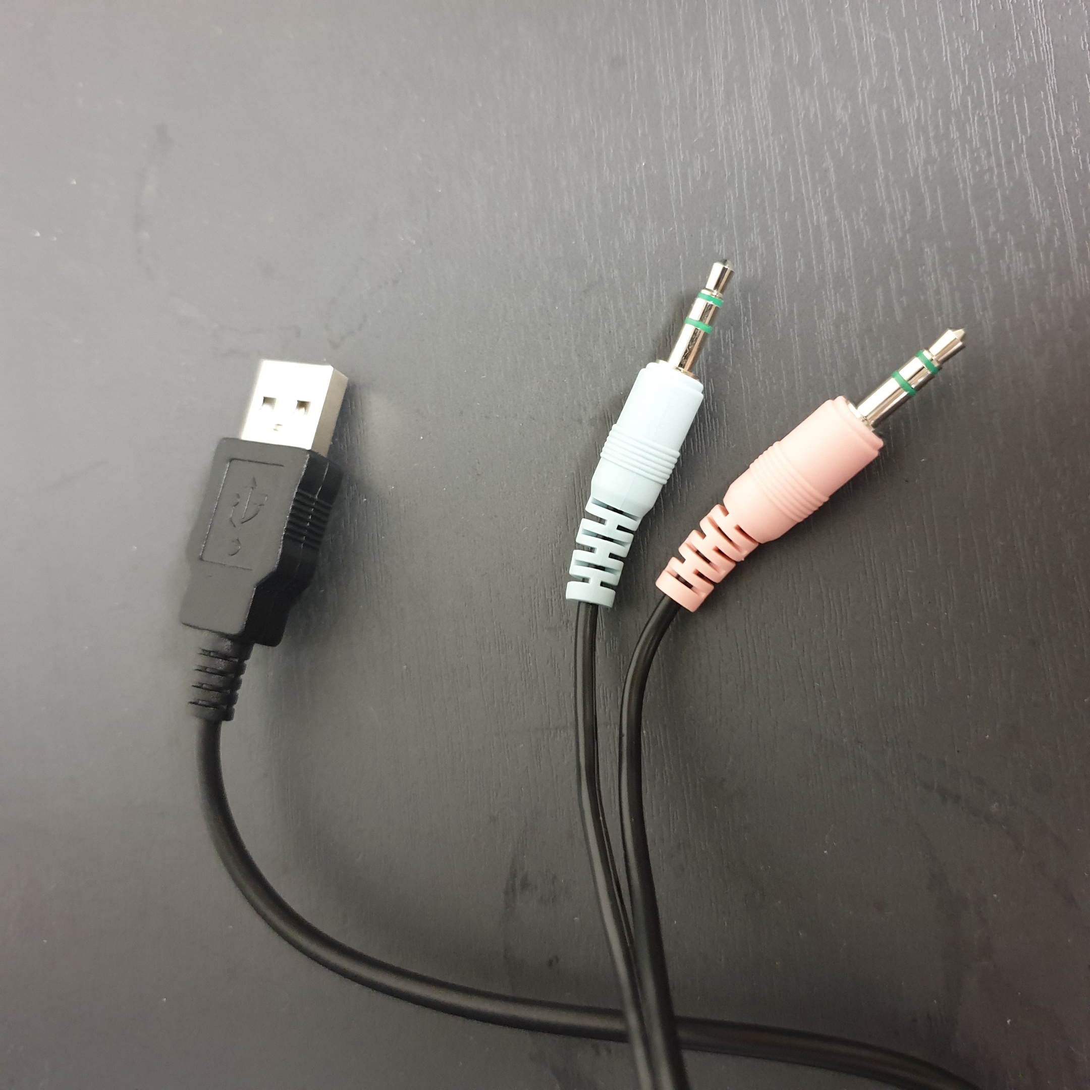 우선 전원은 왼쪽에 보이는 USB 단자를 통해 공급받습니다. 그리고 연결하는 선 두개는 스피커와 마이크를 각각 연결해주시면 되는데요. 보통 스피커는 녹색 단자, 마이크는 붉은 단자에 연결해주시면 됩니다.