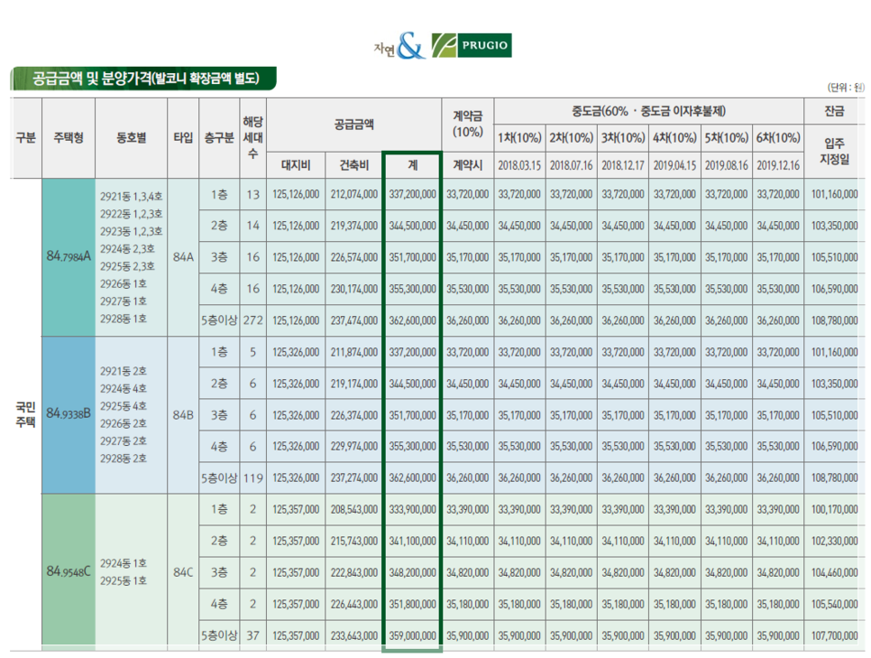아래는 동탄 레이크 자연앤 푸르지오 공공분양 분양가이며 아래와 같이 각 평수별로 공급 금액이 공급계약서에 들어가게되고, 먼저 대지비와 건축비를 합한 금액에 총 지불하셔야 하는 대금입니다. 그리고 어디서 분양하는지에 따라 계약금의 비율은 다르지만 보통 계약시 전체금액의 10% 를 계약금으로 지불해야합니다. 그리고 몇차에 나눠서 10%정도씩 표시된 일정에 맞추어 지불하셔야하고 잔금은 입주하실때 마저 내시고 입주하시면 됩니다.