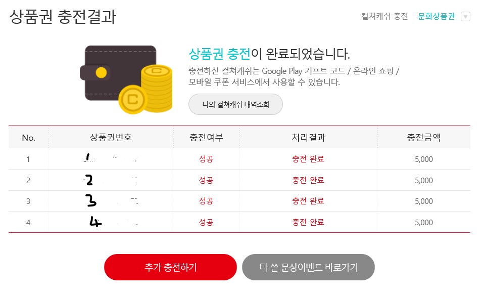 5개 이상을 한번에 충전하시려면 1번 버튼 '더 많은 상품권 충전하기' 를 눌러주시면 되고, 다 입력하셨으면 2번 버튼을 눌러 다음 화면으로 넘어갑니다.