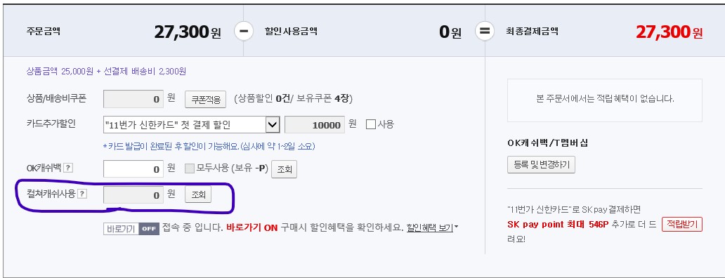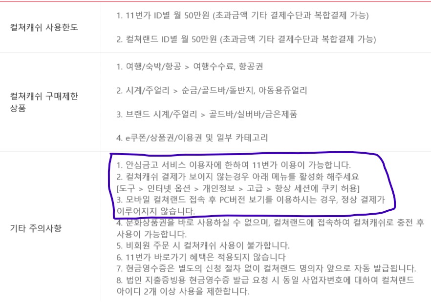 한 예로 11번가는 컬쳐캐쉬 결제가 보이지 않는 경우 대처방안에 대해 적혀있고 모바일로는 정상 진행 불가능 하다는 것을 적어 두었네요.