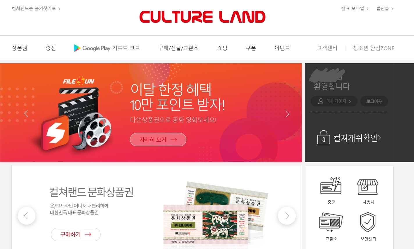 각종 포털에서 문화상품권을 검색하시면 컬쳐랜드 홈페이지로 들어가실 수 있구요. 여기서 회원가입을 먼저 해주시고 로그인 하시면 위와 같은 화면이 뜨게 됩니다.