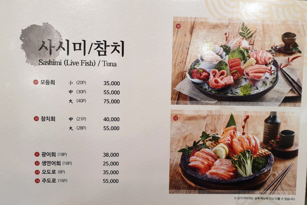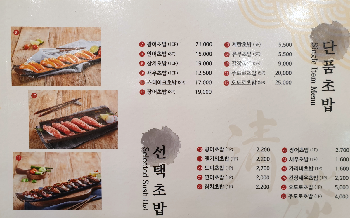 주요 스시와 사시미 메뉴들입니다. 가격은 전체적으로 다른 보통 스시집과 비슷한 수준으로 가격대가 형성 되어 있었습니다. 광어초밥 10pc 에 21,000 원이면 조금 비싼 느낌일수도 있지만, 연어 8pc 에 15,000원인 점을 감안하면 준수한 수준인 것 같습니다.