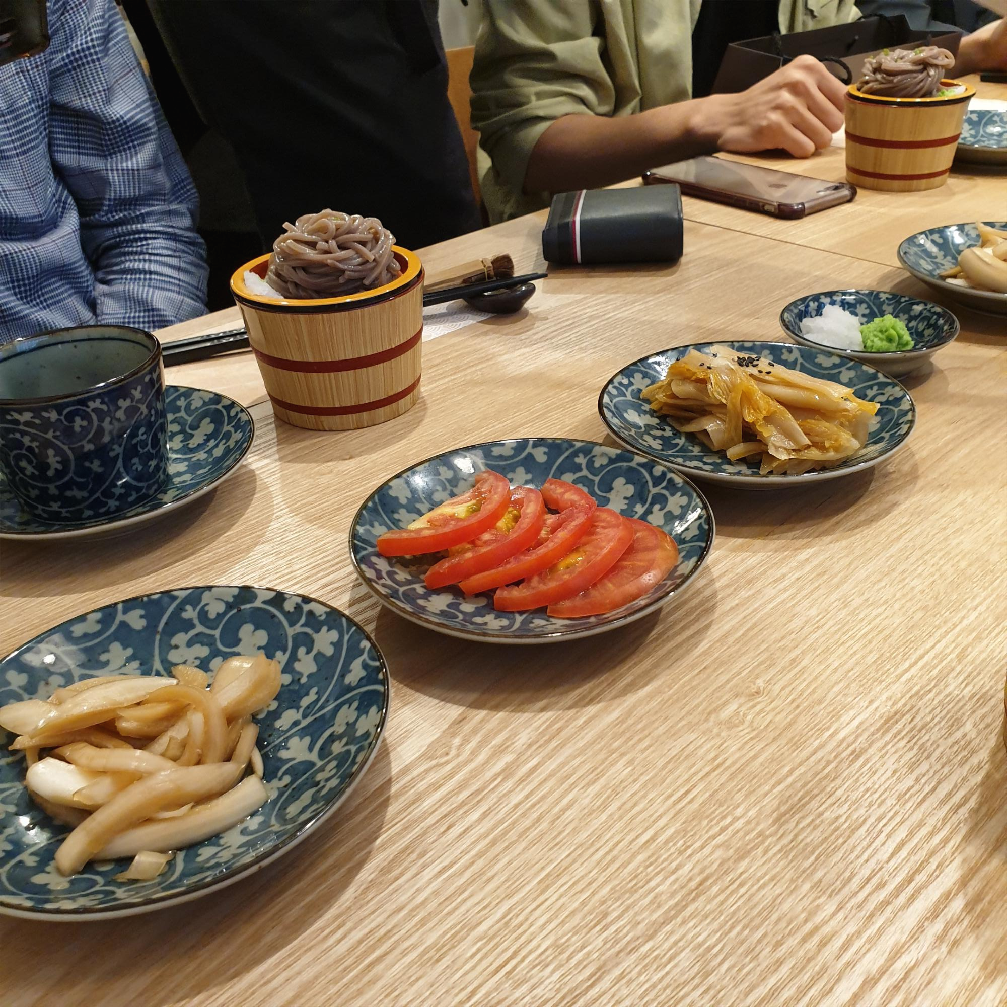 밑반찬으로는 이렇게 양파 절임, 토마토, 배추김치(기무치?), 그리고 소바용 간 무랑 와사비가 제공 됩니다.