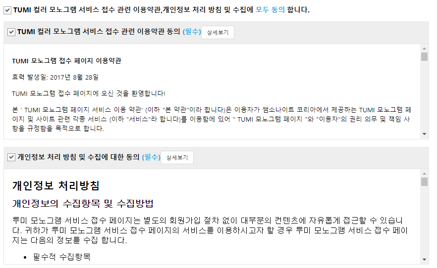 TUMI 컬러 모노그램 서비스 접수 관련 이용약관 동의 (필수)상세보기 TUMI 모노그램 접수 페이지 이용약관 효력 발생일: 2017년 8월 28일 TUMI 모노그램 접수 페이지에 오신 것을 환영합니다! 본 ' TUMI 모노그램 페이지 서비스 이용 약관' (이하 "본 약관"이라 합니다)은 이용자가 쌤소나이트 코리아에서 제공하는 TUMI 모노그램 페이지 및 사이트 관련 각종 서비스 (이하 "서비스"라 합니다)를 이용함에 있어 " TUMI 모노그램 페이지 "