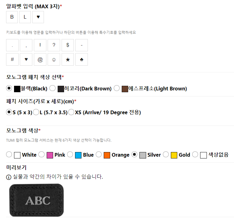 '모노그램 색상'은 글자색으로 저는 실버를 선택했습니다.