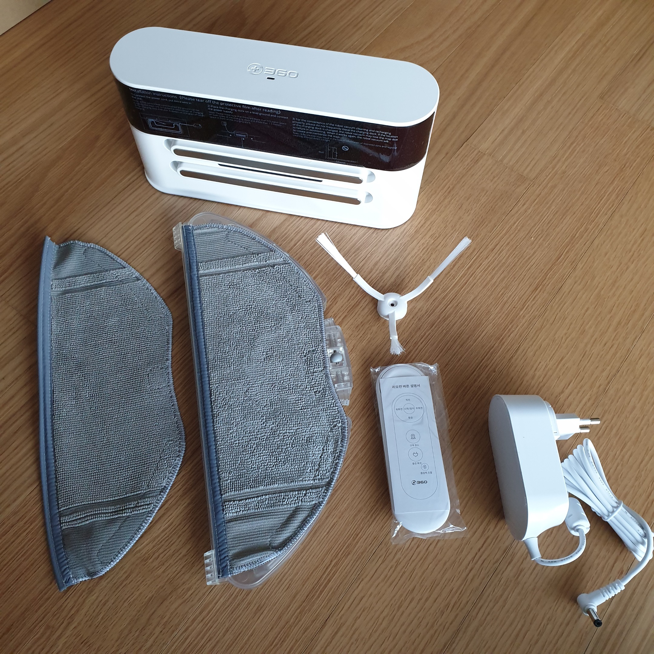 그리고 이렇게 리모컨, 충전기, 물걸레 등이 있는데. 치후 360은 모바일로 다 조작이 가능하기 때문에 리모컨은 별로 필요 없어서 창고에 박아뒀네요.