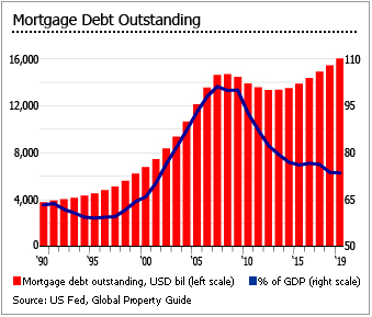미국 연방준비제도이사회(FRB)에 따르면 금리 하락에 힘입어 주택담보대출 잔액은 2019년 3.75%, 2018년 3.56%, 2017년 3.81%, 2016년 3.43%로 연평균 성장함에 따라 2020년 2분기 16조2800억 달러로 전년 동기 대비 4% 증가했다. 1~4가구 규모의 주택이 2020년 2분기 미지급 주택담보대출 총액의 약 69.4%를 차지했다.