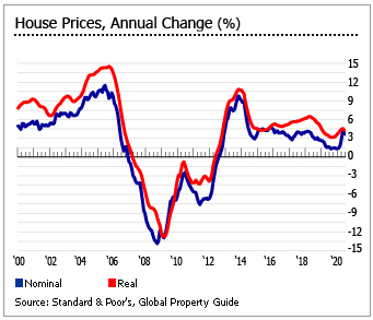 S&P/Case-Shiller의 계절조정 주택가격지수는 2020년 2분기(3.62%)로 전년 동기 대비 3.29% 상승했다. S&P/Case-Shiller에 따르면, 주택 가격은 최근 분기 동안 2.17% 상승했다(물가상승률 조정 2.29%).