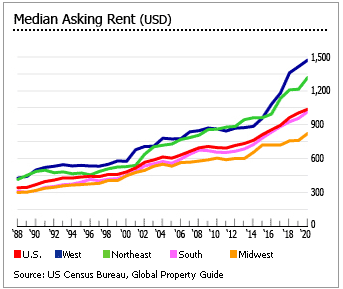 임대료 상승은 건강한 경제 펀더멘털의 또 다른 신호이다. 미국 인구조사국에 따르면 2020년 2분기 미국의 평균 집세 요구액은 월 1033달러로 2.5% 증가했는데 이는 전 분기의 기록적인 월세 1,041달러에 이어 두 번째로 높은 수준이다.