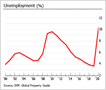 노동시장은 약간 호전될 조짐을 보인다. 실업률은 2020년 4월 14.7%로 사상 최고치를 기록한 후, 2020년 7월에는 10.2%로 떨어졌다. 그러나 2015년부터 2019년까지의 평균 실업률인 4.4%보다 훨씬 높은 수준을 유지하고 있다.