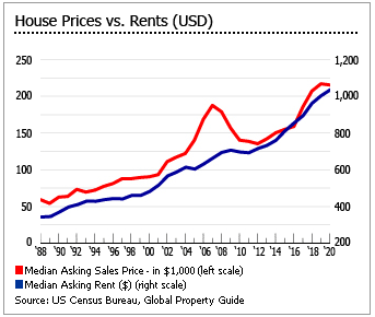 미국 인구 조사국에 따르면, 새 주택의 평균 매매 가격은 2020년 8월에 전년 동월대비 4.34% 하락한 31만2천800달러를 기록했다. 미국부동산협회에 따르면, 기존 주택의 경우, 2020년 8월에 중간 가격이 1년 전보다 11.4% 오른 31만600달러를 기록했다고 한다. 8월의 물가 상승은 102개월 연속 상승을 기록했다.