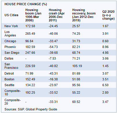 스탠더드 앤드 푸어스(S&P)에 따르면 전국 20개 주요 도시에서 주택가격 상승세가 지속되고 있으며 피닉스지역이 2020년 2분기까지 1년간 8.96%로 가장 높은 상승률을 기록했으며 시애틀(6.5%), 탬파(5.89%), 샬럿(5.74%), 클리블랜드(5.4%), 미니애폴리스(5.39%)와 샌디에이고(5.39%)가 그 뒤를 이었다. 포틀랜드(4.25%), 애틀랜타(4.2%), 마이애미(4.03%), 덴버(4.02%), 로스앤젤레스(3.91%), 워싱턴(3.54%), 보스턴(3.51%), 라스베이거스(3.33%), 디트로이트(3.07%), 댈러스(3.0%) 등에서 비교적 완만한 집값 상승세가 나타났다. 뉴욕은 1.67%의 최저 집값 상승률을 보였고 샌프란시스코(1.45%), 시카고(0.6%)도 마찬가지였다.
