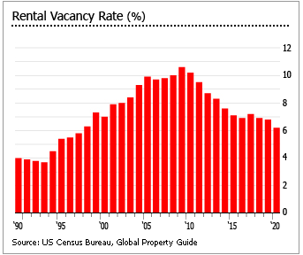 2020년 2분기 전국 임대료 공실률은 5.7%로 미국 인구조사국의 수치를 보면 전분기(6.6%)와 1년 전(6.8%)보다 낮아졌다. 그것은 1984년 2분기 이후 가장 낮은 수준이었다.