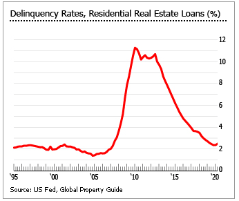 미국 연준에 따르면, 마찬가지로 단독주택 담보대출 연체율은 2019년 2분기 2.56%, 2018년 2분기 3.2%, 3년 전 3.66%에서 2020년 2분기 2.49%로 떨어졌다.
